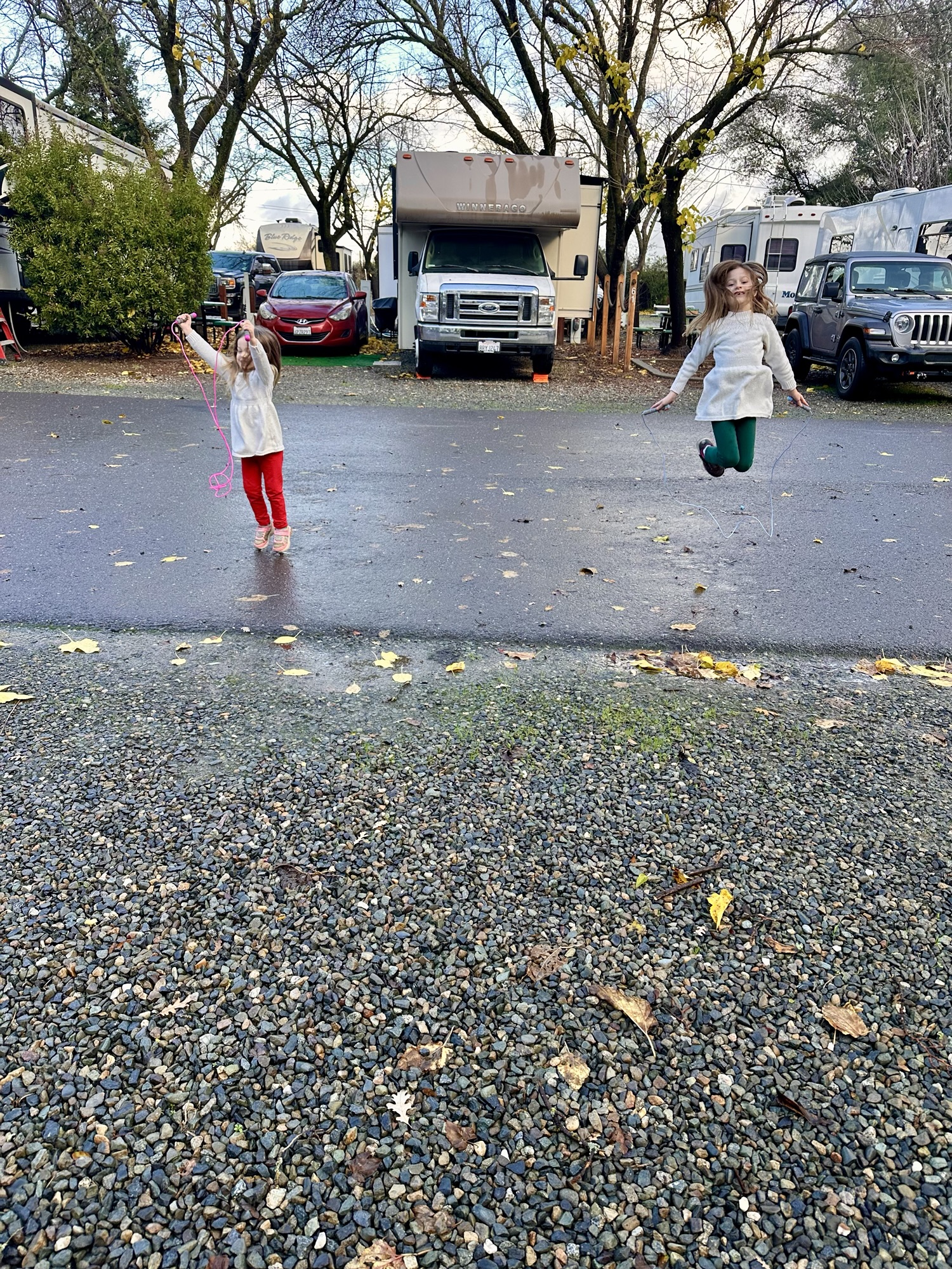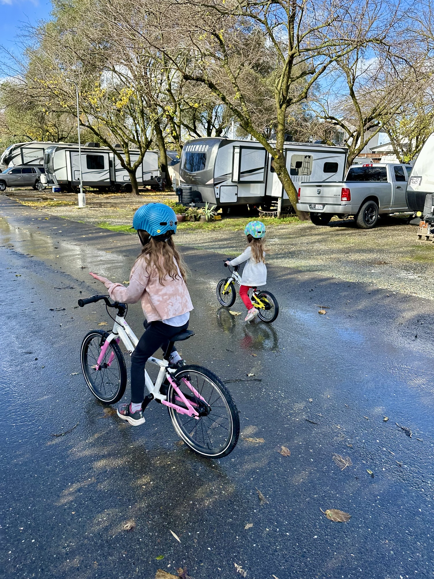 The girls were outside each time the rain stopped on Christmas Day, enjoying their new bikes.